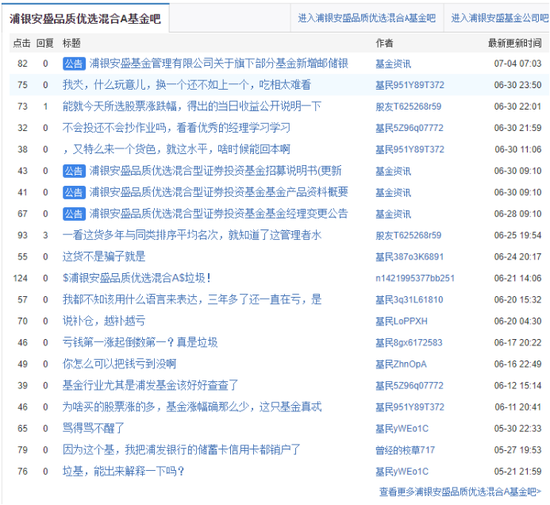 多只产品持续亏损,让基民苦不堪言。在基金吧里,满是投资者的抱怨:“三年多了还一直在亏,是说补仓,越补越亏”“亏钱第一涨停倒数第一?真是垃圾” ,甚至有基民因产品亏损,愤而注销浦发银行储蓄卡与信用卡,负面情绪溢于言表。