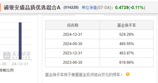 与持续亏损形成鲜明对比的,是蒋佳良管理产品的高换手率。浦银安盛品质优选混合A 的换手率数据显示,2023 年 6 月 30 日为 619.66% ,2023 年 12 月 31 日 483.87% ,2024 年 6 月 30 日 480.55% ,2024 年 12 月 31 日 529.29% 。